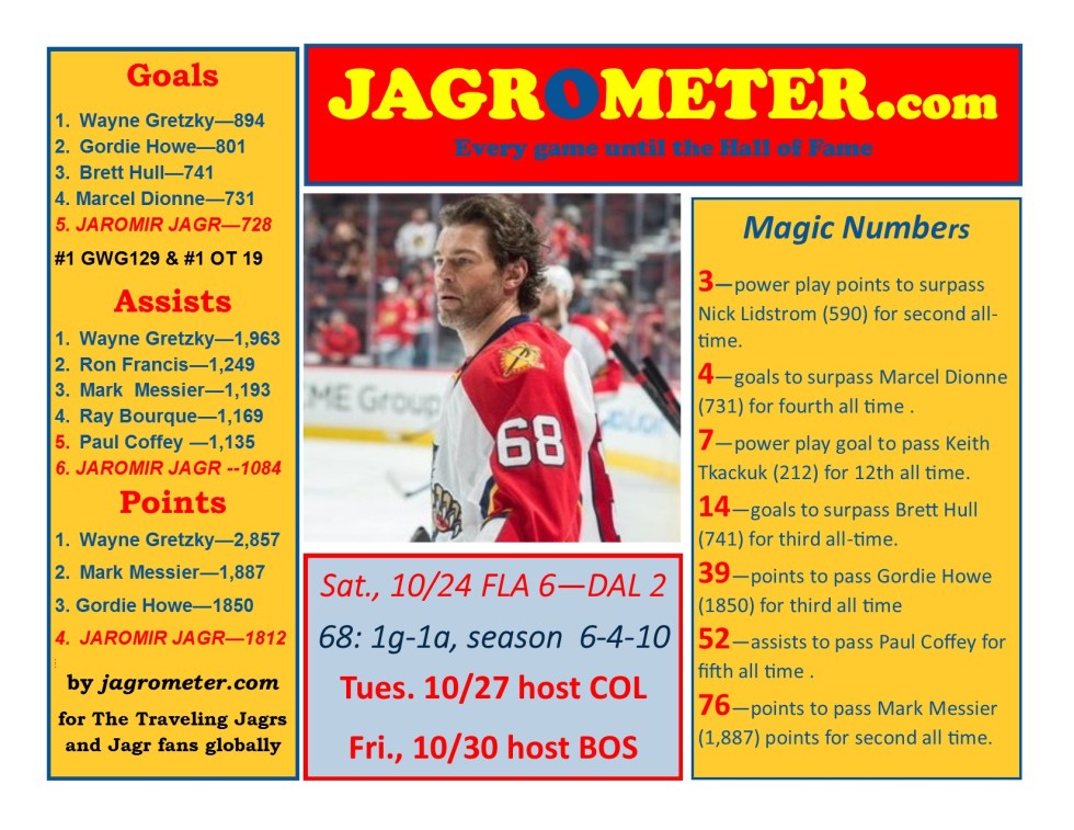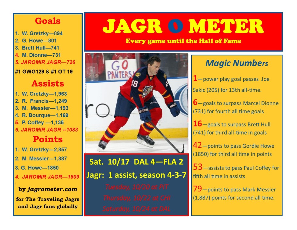 Game 8: FLA 6–Dallas 2, Jagr goal (6), assist (4). Start homestand Tuesday