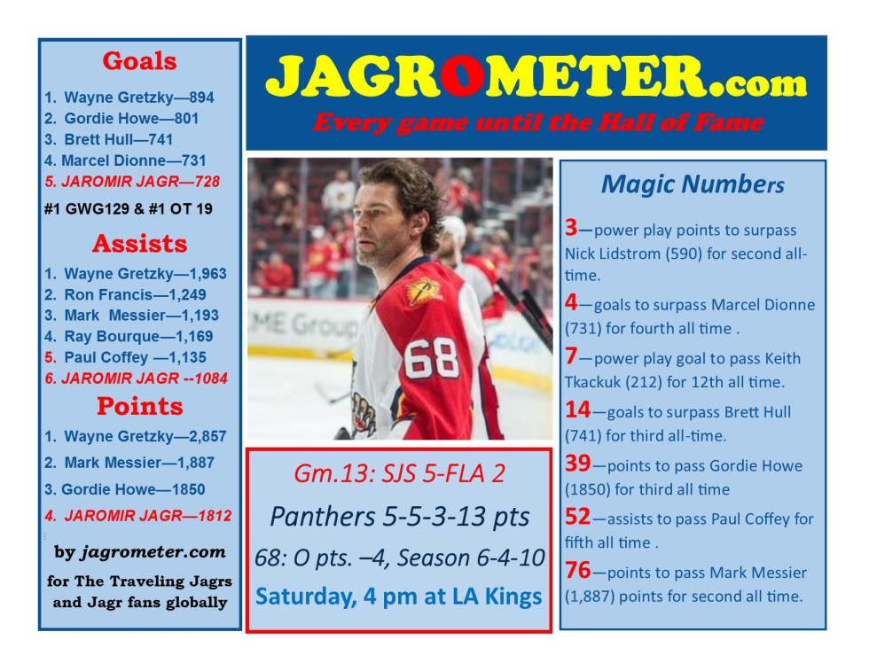 Game 14: LA 4-Florida 1: Jagr 0 points.