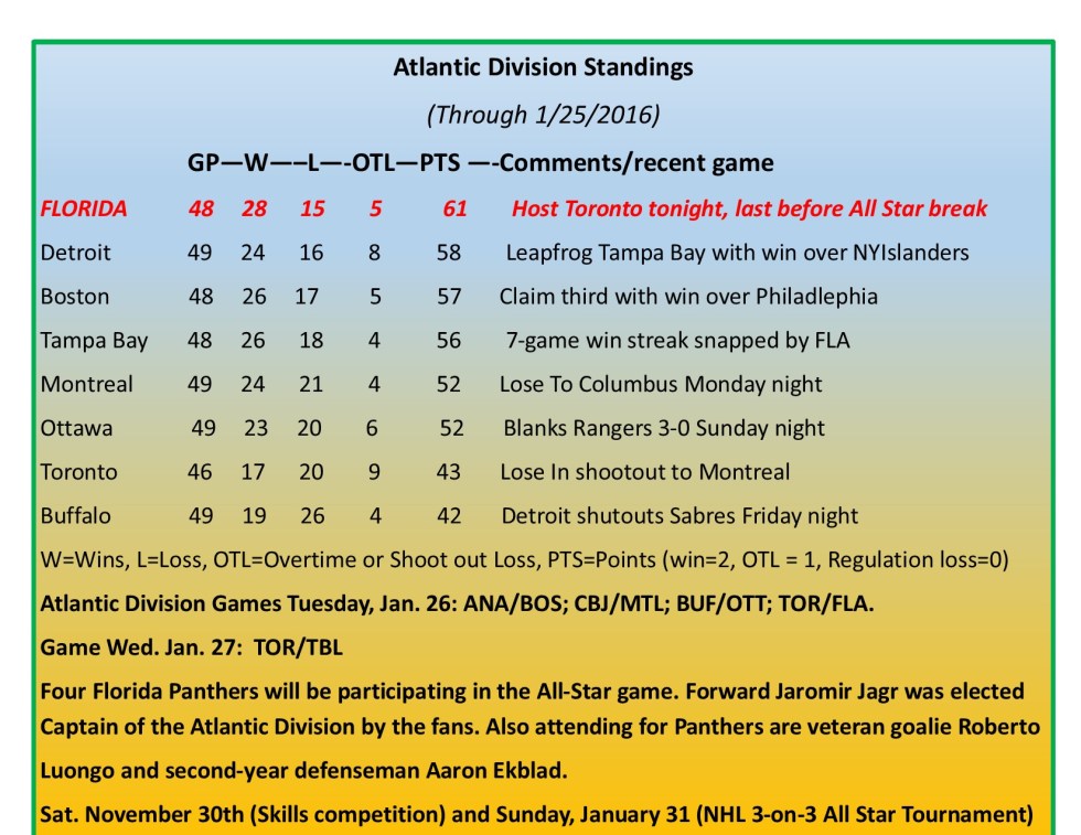 Game 49: Florida 5-Toronto 1, finish Jan. 8-3-1. Jagr, Eblad, Luongo and Coach Gallant headed to All-Star Weekend
