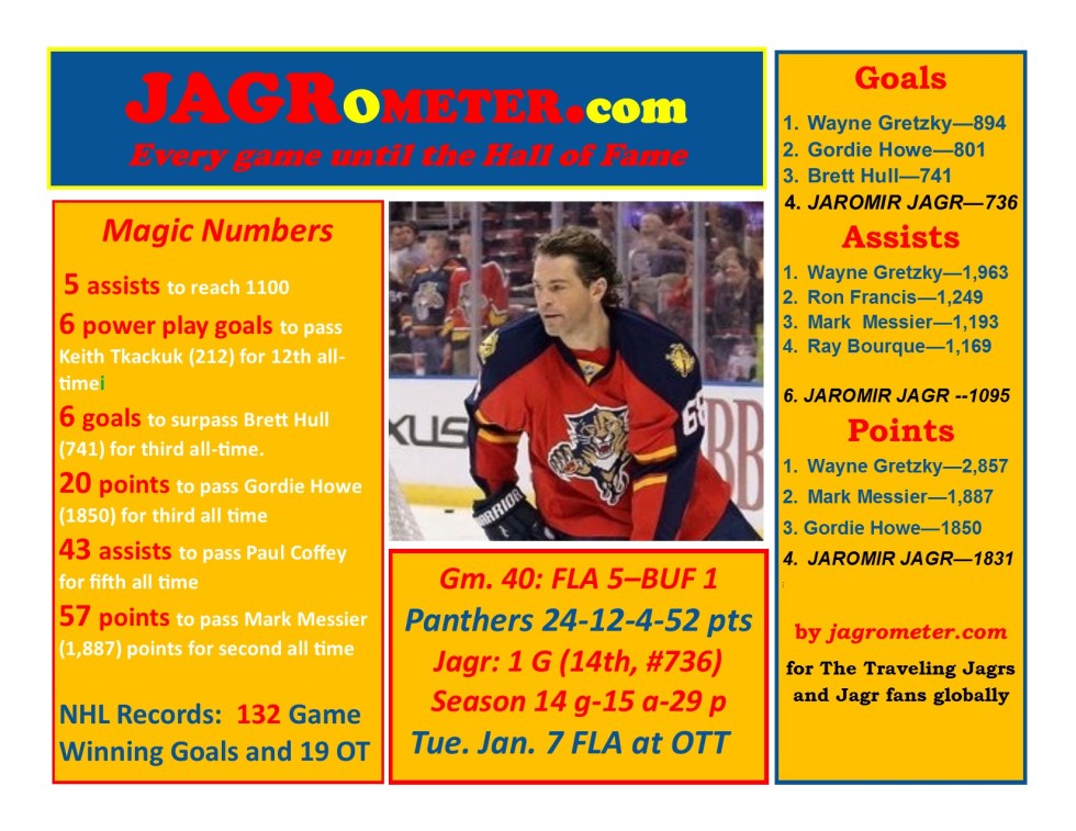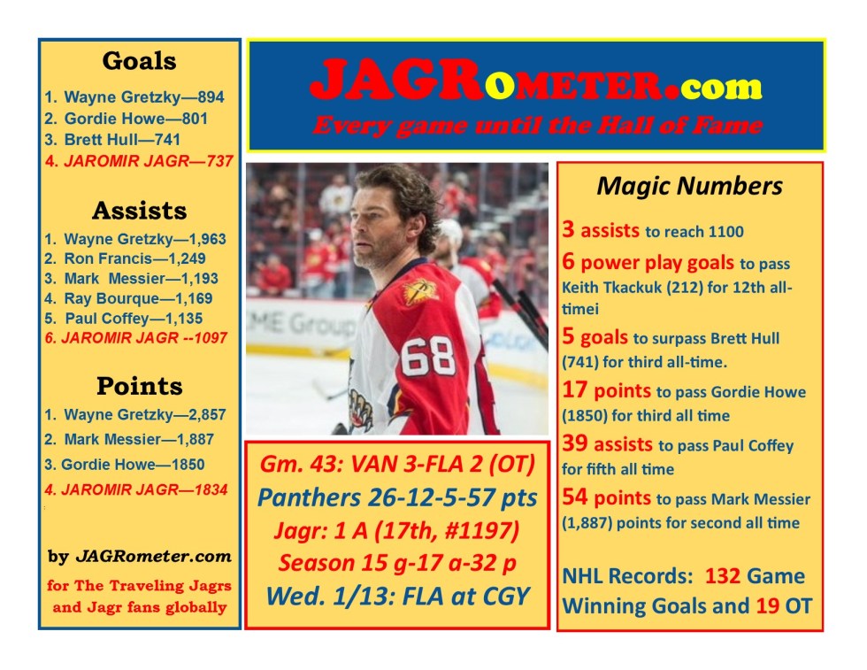 Game 43: Vancouver snaps Florida 12-game win streak with 3-2 OT victory. Jagr assist (#1197)
