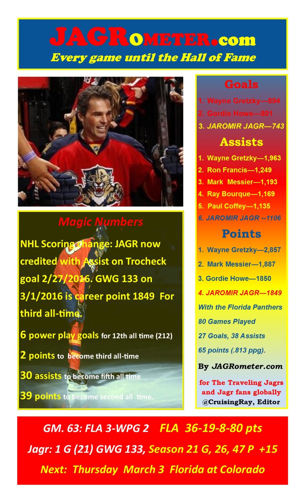 Game 63: @FLAPanthers 3-@NHLJets 2; Jagr goal (21) career goal 743 for career point 1849 as NHL announces assist awarded from weekend game with Columbus