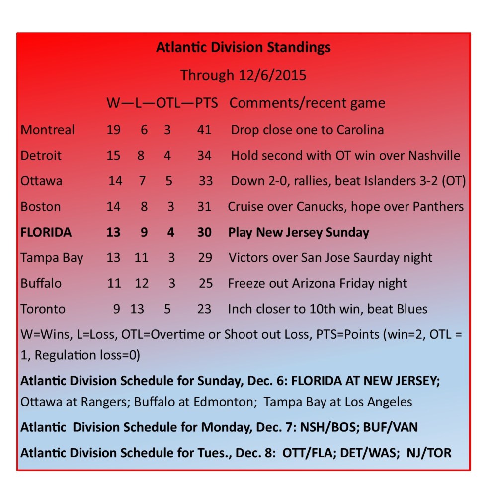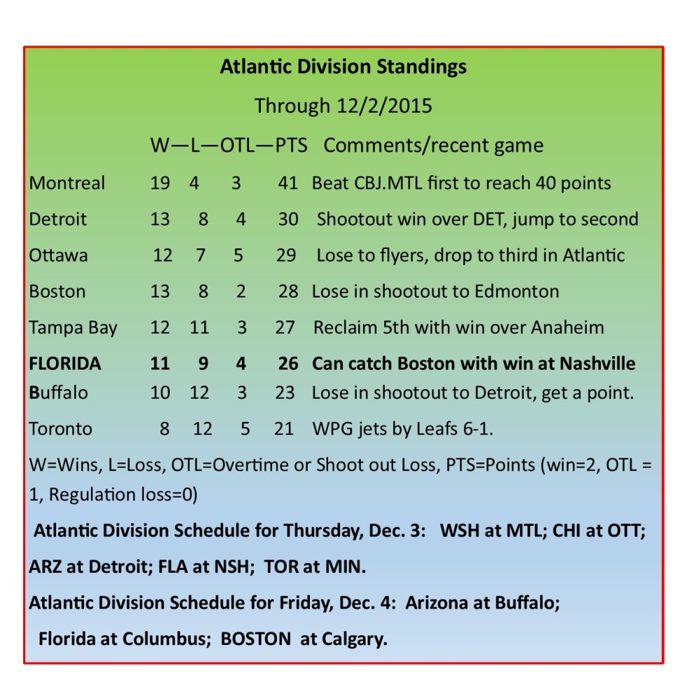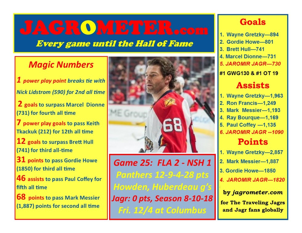 GAME 25: FLA 2-Nashville 1 as Panthers win fourth straight, Jagr O points.