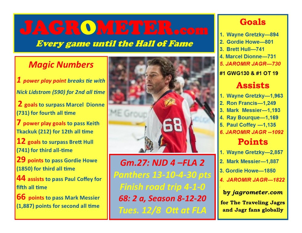 Game 27: NJ Devils 4-Florida 2 as five game win streak ends, Jagr two assists as reunited line reignites old magic.